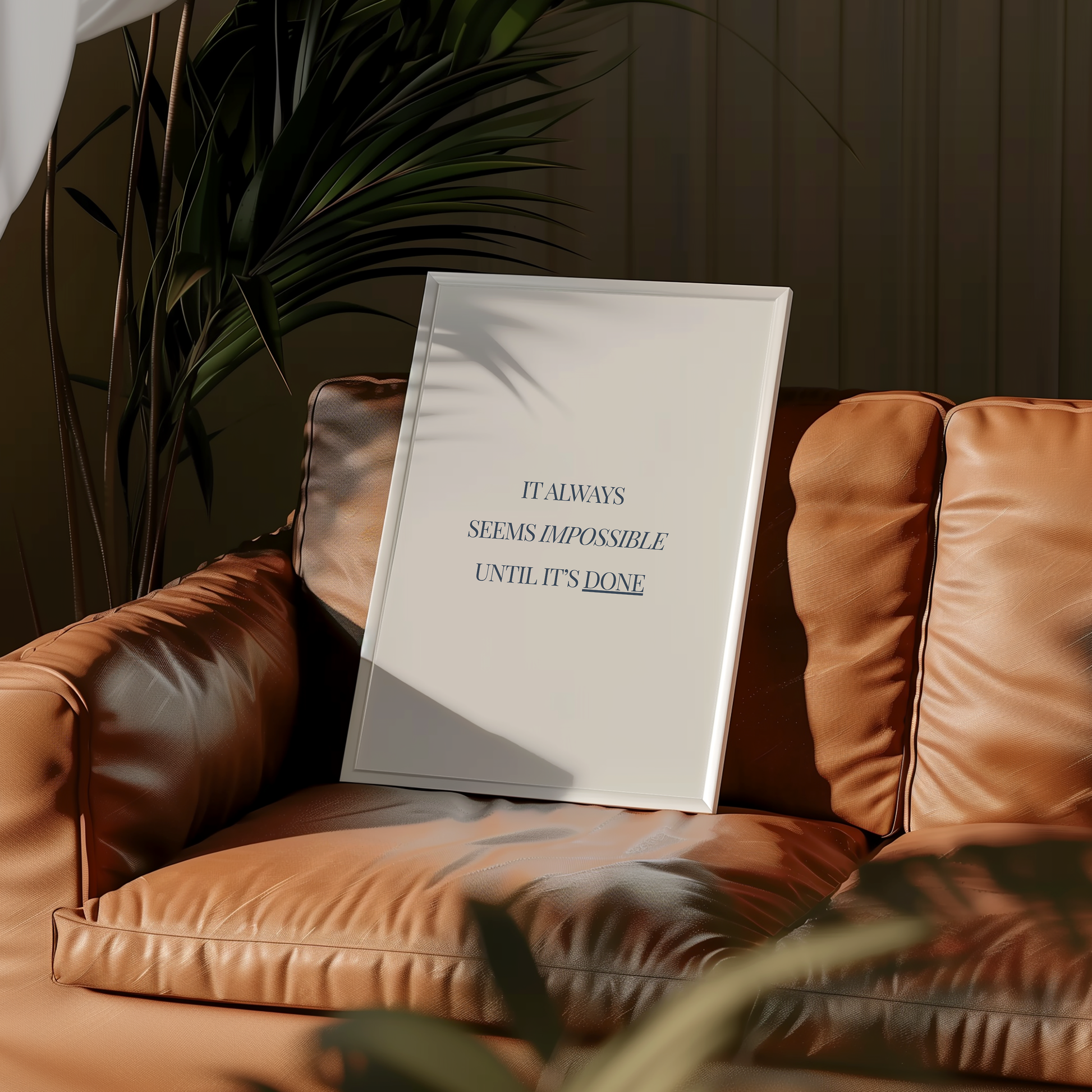Bring motivation and resilience into your home or workspace with this minimalist typography print. Featuring the timeless quote “It Always Seems Impossible Until It’s Done”, this poster serves as a daily reminder to persevere, overcome challenges, and celebrate achievements.