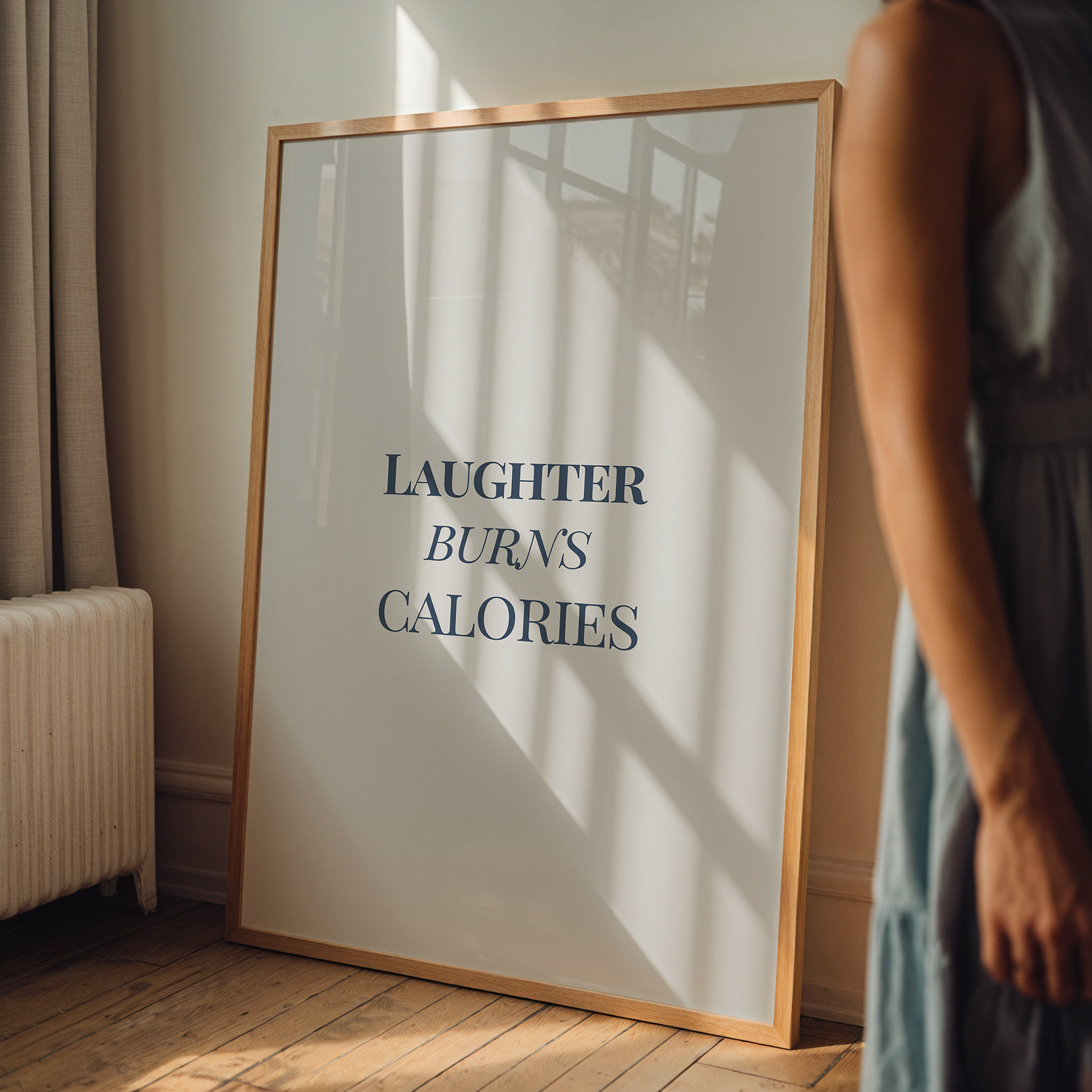 Inject a bit of humour and charm into your home or office with this chic quote print. Featuring the witty phrase “Laughter Burns Calories” in classic serif navy typography, it’s the perfect blend of style and sass for fitness lovers, home gyms, or anyone who appreciates a light hearted approach to wellness.