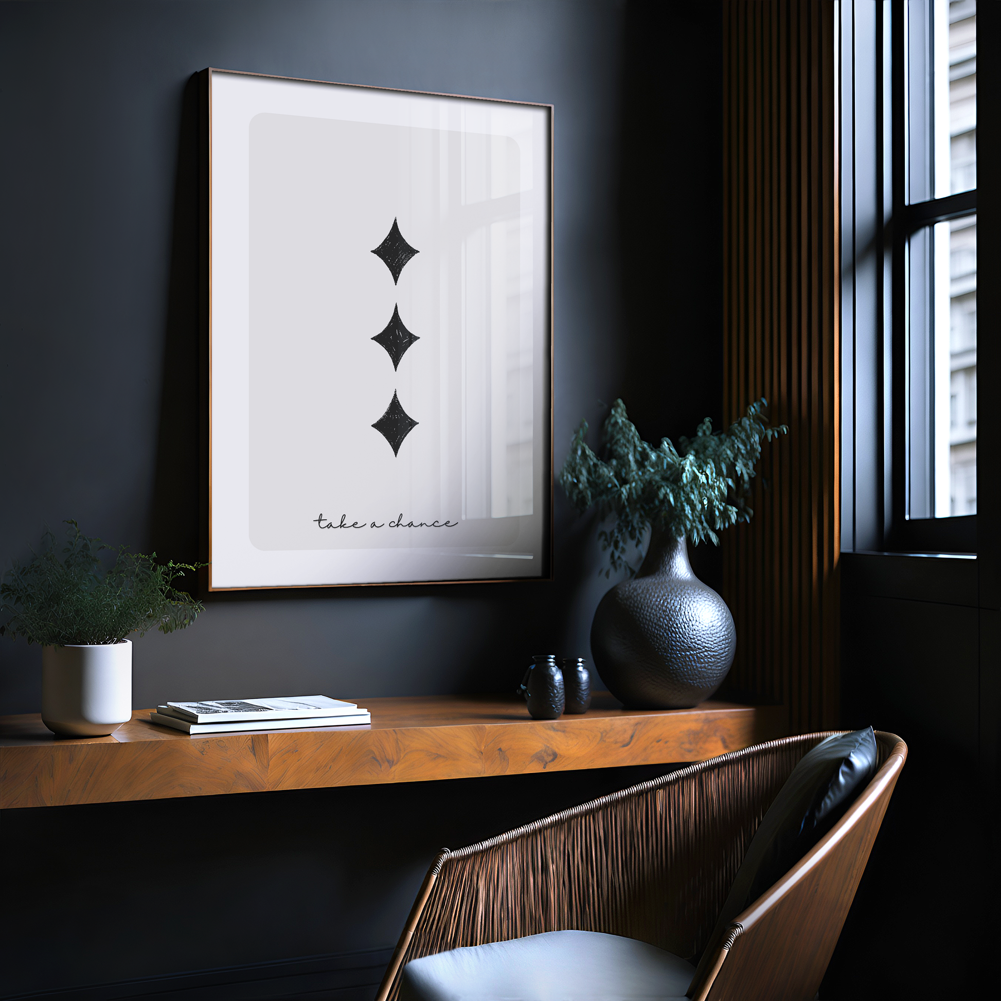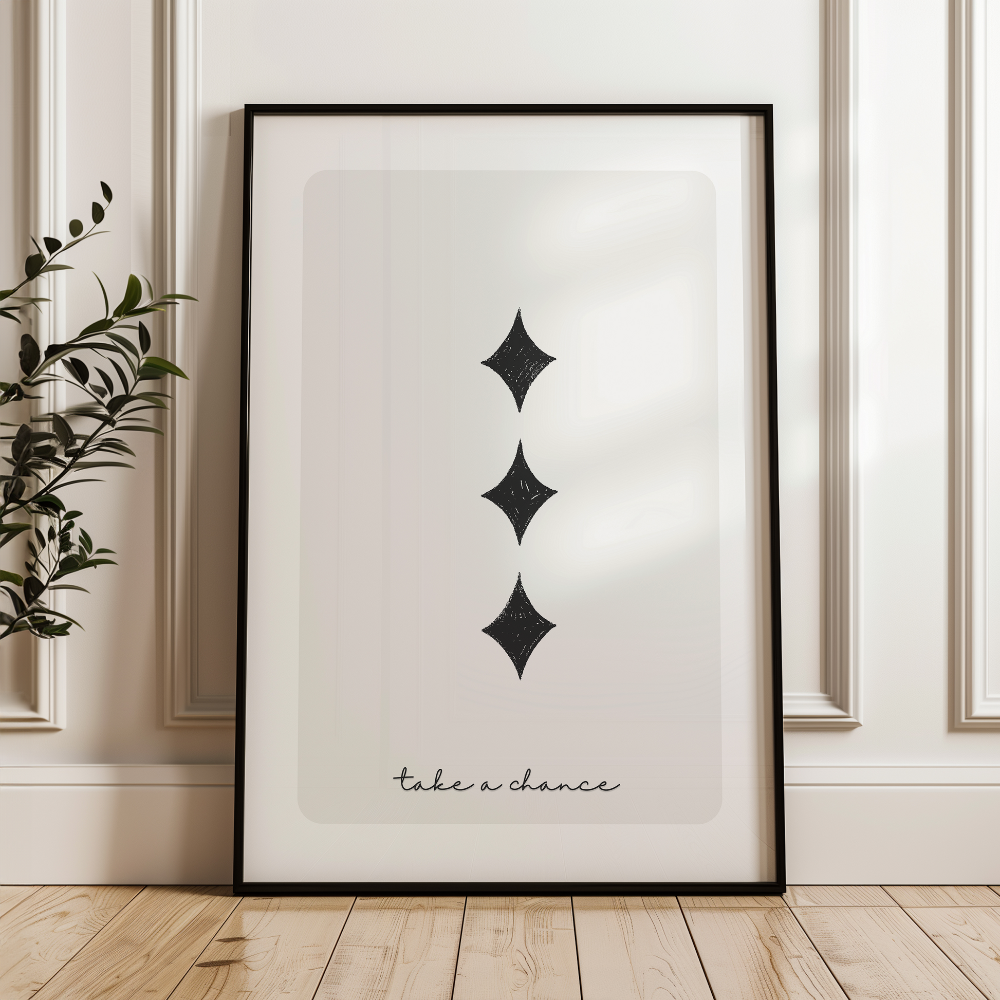 Make a bold statement with this "Take a Chance" 3 of Diamonds poster, designed in sleek black and white for a timeless, minimalist look. Featuring a motivational quote and classic card symbolism, this print is perfect for modern spaces, inspiring daily confidence and creativity.